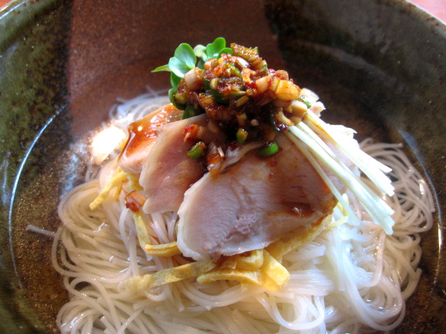- 茹で上がったそうめんを冷水でよく洗い流し器に入れ、錦糸卵、蒸し鶏、カイワレ、を乗せ、冷やしておいたスープを注ぎ入れて、お好み量の韓国ダレを入れて出来上がり!!