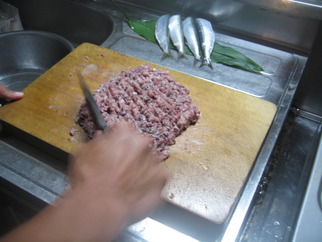 - 生姜をみじん切りにする。下ろした鰯を包丁でたたく。途中でみじん切りにした生姜を入れて混ぜながらたたく。