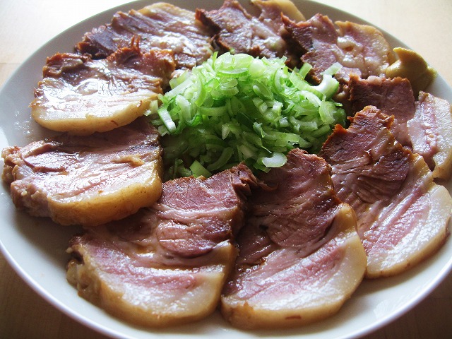 - 次にネギを取り出し、醤油と砂糖を入れて1時間弱火で煮込み火を止めて冷まし、固まった油の膜を取って、肉を適当な大きさに切り、煮詰まったタレをかけ、刻みネギとからしを添えて出来上がり!