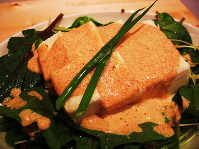 - 豆腐を8当分に切り、ほうれん草とカイワレダイコンの上に乗せる。
