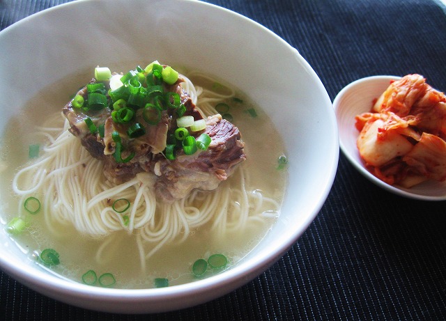 - 茹でたそうめんを器に入れて煮込んだスープと骨を取った肉、ネギを入れて出来上がり!お好みで塩こしょう、ゴマ、キムチなどを入れて自分でお好みの味を作って下さい。