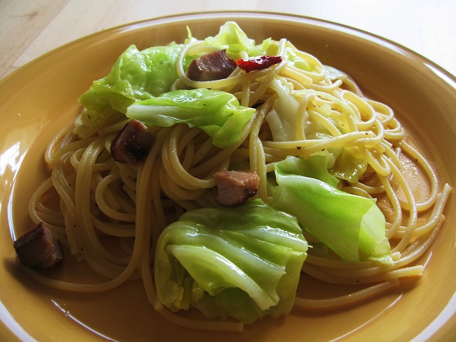 - 茹で上がったスパゲティーとキャベツを3んい入れて絡め、味が薄ければ塩コショウで味を調えオリーブオイルを少しかけて出来上がり!