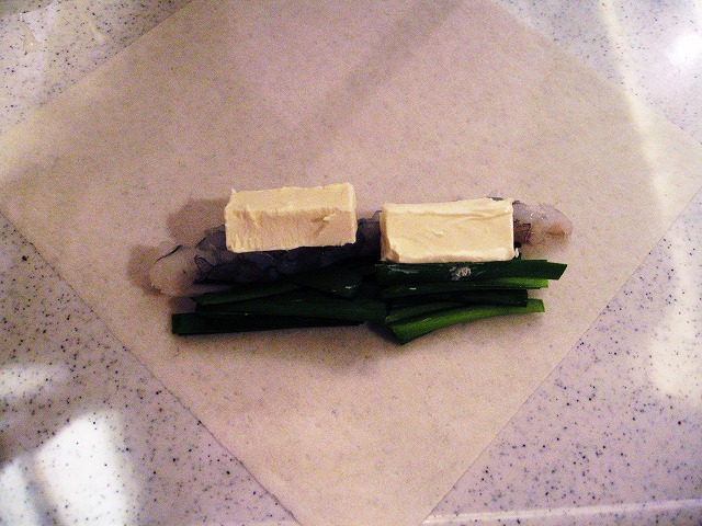 - 春巻きの皮にニラ、エビ、クリームチーズを乗せて巻く。端っこに小麦粉と水を混ぜたノリをつける。