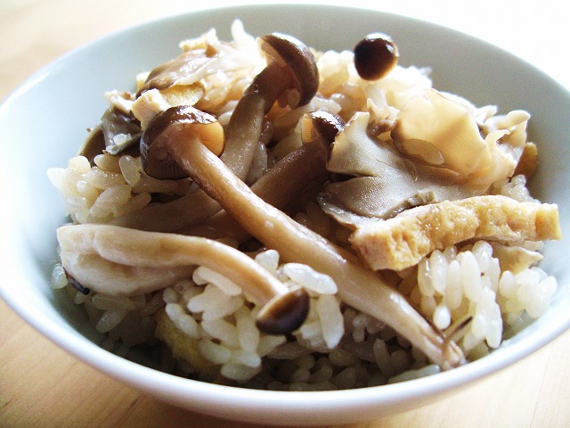- しめじ、椎茸のいしずきを切り取り、しめじ、舞茸はある程度の大きさに割く。椎茸、油揚げは1㎝幅程に切る。
